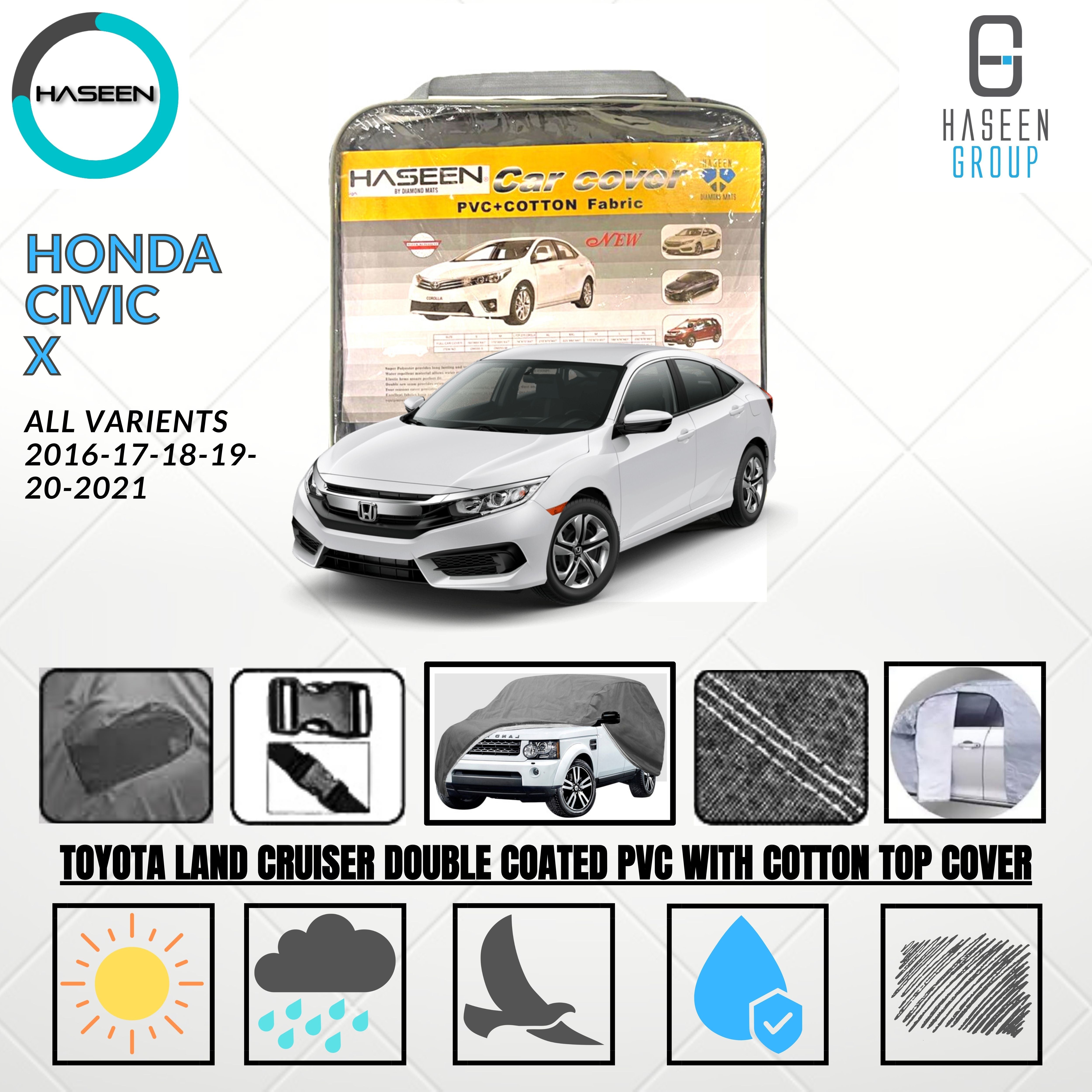 Discover HONDA CIVIC X 2016-2021 DOUBLE COAT PVC WITH COTTON CAR COVER: high-quality car top covers refined for modern vehicles. Made from durable PVC. Available in Black. Durable, dependable, and hassle-free.
