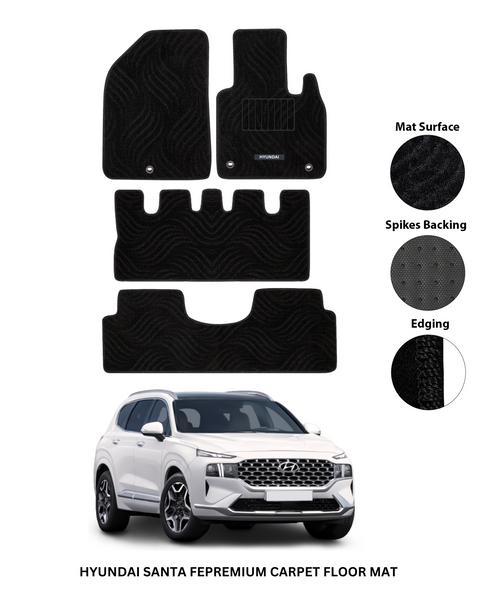 Discover HYUNDAI SANTA FE NEW 2024 PREMIUM CARPET CAR FLOOR MAT: high-quality premium carpet mats refined for modern vehicles. Made from durable Premium Carpet. Available in Black. Durable, dependable, and hassle-free.