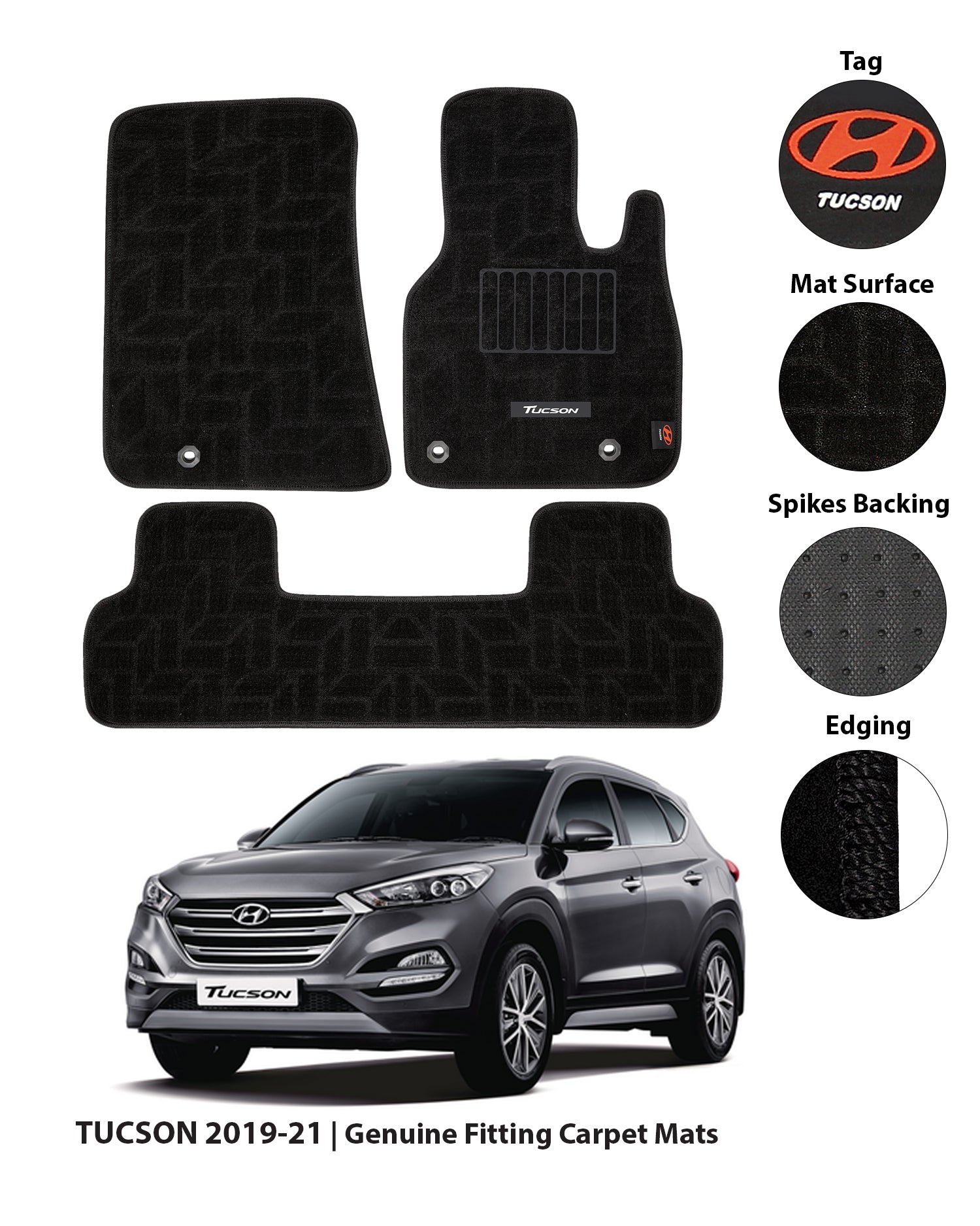 HYUNDAI TUCSON 2019-PRESENT PREMIUM CARPET CAR FLOOR MAT brings a tailored fit to your premium carpet mats. Made from durable Premium Carpet. Available in Black. Resistant to wear, easy to clean, and made for everyday use.